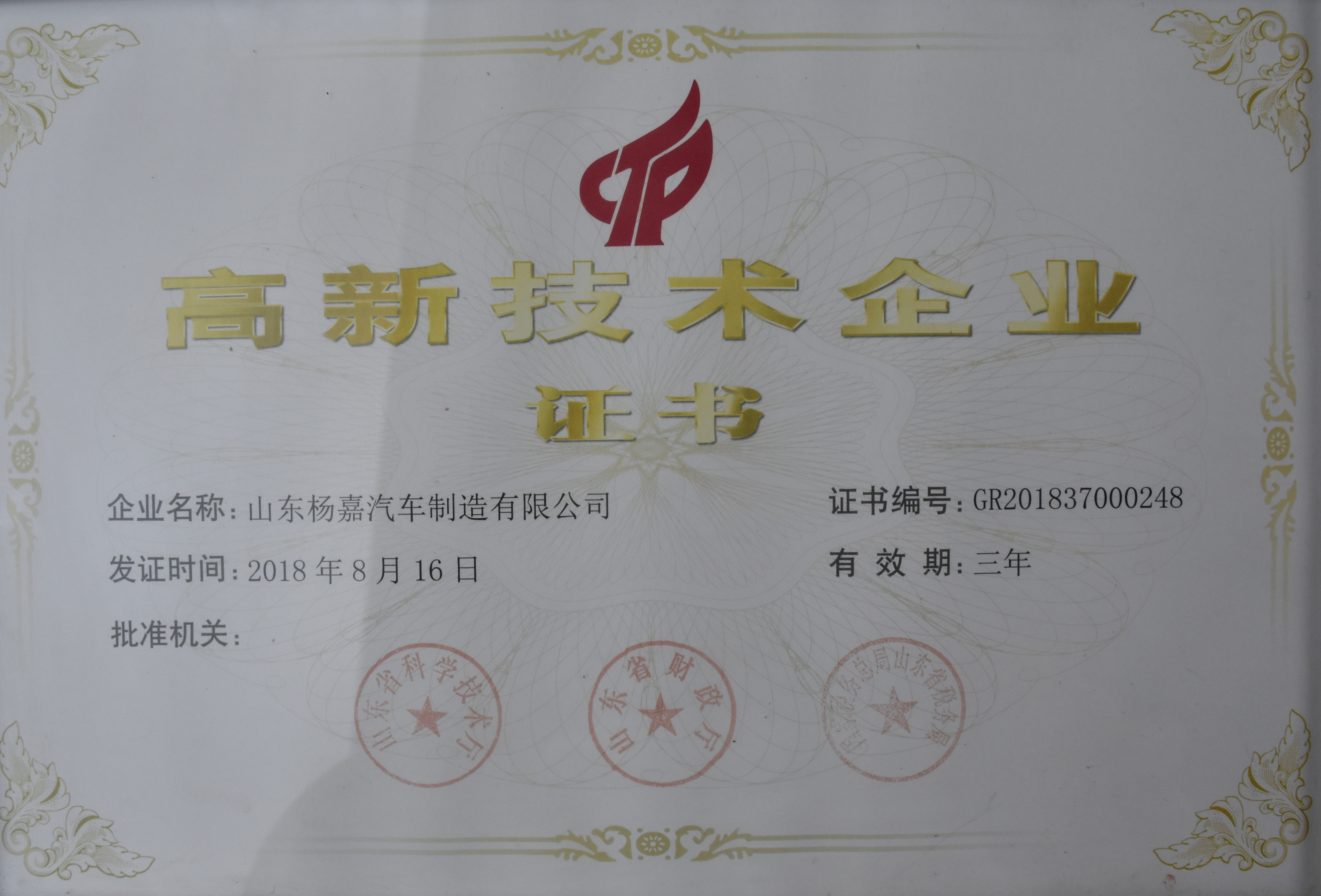 公司通過了“3C”強制性產品質量認證、ISO9001質量管理體系認證、ISO14001環境管理體系認證和OHSAS18000職業健康安全管理體系 認證;公司榮獲山東省“守合同 重信用”單位、市級工程技術研究中心、省級“一企一技術”企業,“楊嘉牌”先后榮獲山東省著名商標、山東名牌產品、國家級專精特新“小巨人”企業、山東省單項冠軍企業。