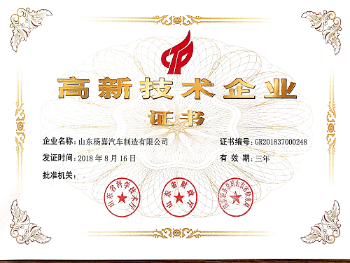 近日,山東楊嘉汽車制造有限公司繼2015年后,再次被山東省科學技術廳、山東省財政廳、國家稅務總局山東省稅務局聯合認定為《國家級高新技術企業》。