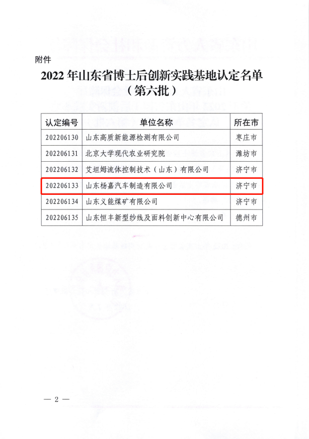 導讀:《山東省人力資源和社會保障廳關于2022年山東省博士后創新實踐基地認定名單的公告(第六批)》中明確了山東楊嘉汽車制造有限公司等六家單位為山東省博士后創新實踐基地