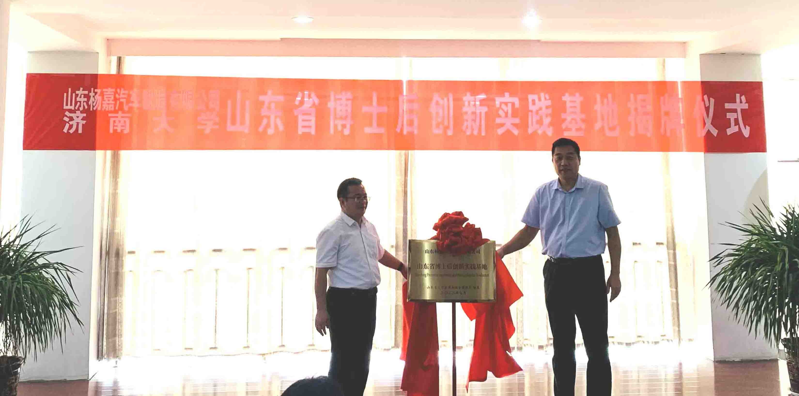 濟南大學機械工程學院院長曹樹坤與梁山縣副縣長陳秀生共同為博士后創新實踐基地揭牌。